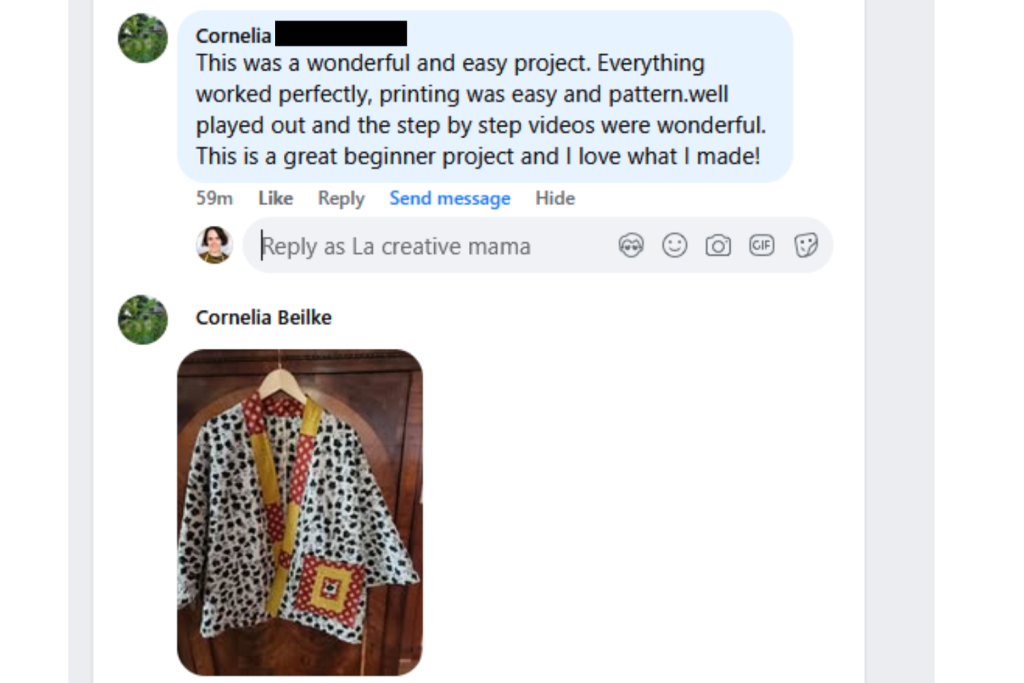 There were so many videos taking you through every step, how to print out the pattern, assemble the pieces, and sew the kimono top. Sustainability is very important to me because as quilters and sewers, we create a lot of scraps and waste. — Angelique – from mojoquiltsandmore